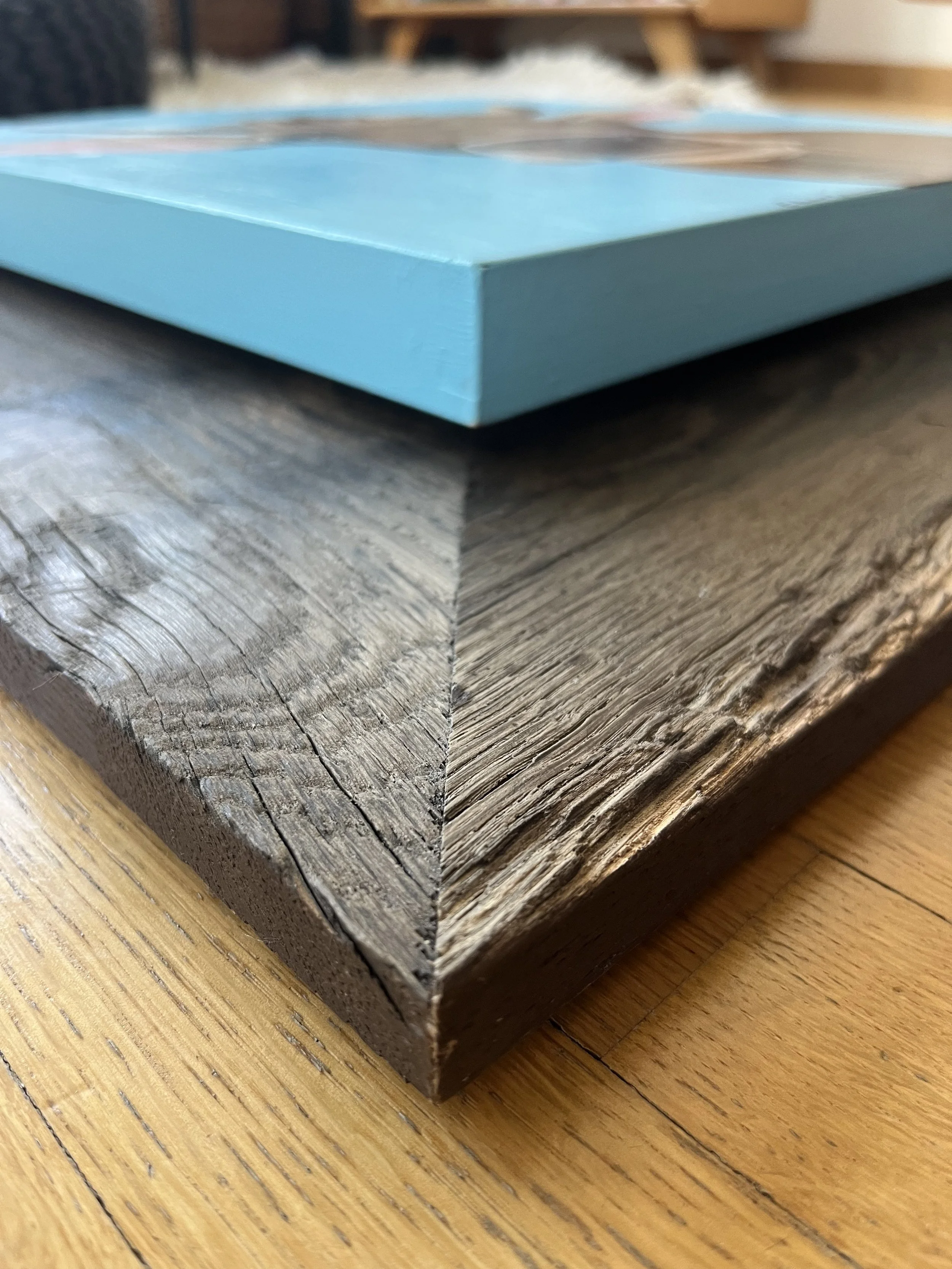 I collaborate with a local carpenter who specializes in crafting frames from recycled Swiss barn wood, giving each piece a unique sense of history and character. These handcrafted frames reflect a shared commitment to local production and creativity. Custom frames can be made to order, allowing each piece to be custom and unique.